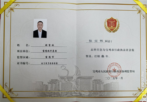 在此次会议上,宝鸡市瑞丰集团董事长张宝林被聘任为“宝鸡市行政执法社会监督员”,宝鸡市瑞丰集团被选定为“全市行政执法监督联系点”,这是对瑞丰集团和张宝林董事长良好社会形象和积极参与社会管理工作的充分肯定。此次选聘的社会监督员和联系点将为行政执法监督工作带来多元视角和创新思路,有助于全方位、全流程、常态化、长效化监督行政执法工作,全面提升宝鸡市行政执法质量,为全市高质量发展提供行政执法监督力量。